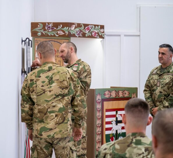 A református tábori lelkész bemutatta a megújult debreceni imatermet, melyet Vass Antalról, a 39-esek I. világháborús, legendás református tábori lelkészéről neveztek el. A lelkész – mint minden évben – felolvasta a zászlóalj „vezérigéjét”: „Mindenütt szorongatnak minket, de nem szorítanak be, kétségeskedünk, de nem esünk kétségbe; üldözöttek vagyunk, de nem elhagyottak; letipornak, de el nem veszünk; Jézus halálát mindenkor testünkben hordozzuk, hogy Jézus élete is láthatóvá legyen testünkben” (2Kor 4,8-10). Rövid igehirdetésében arról beszélt, mit jelent egy csapathoz, közösséghez tartozni, mely átível az idő és tér korlátjain, „melyben ott vannak az egykori 39-esek, a jelenlegiek, sőt a családtagok, feleségek, gyermekek is. És ennek a csapatnak a feje a Krisztus Jézus.” ![]()