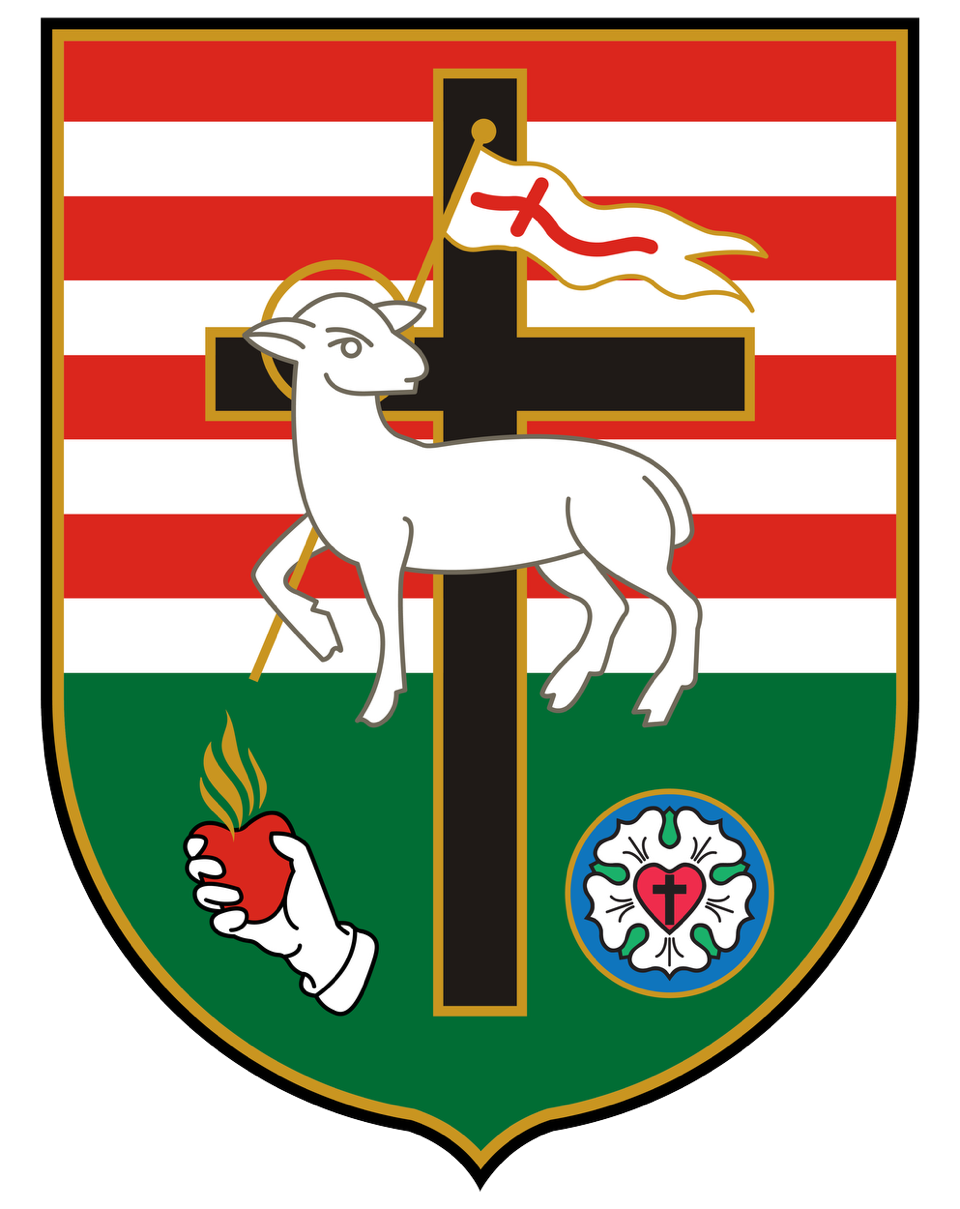 Középen hosszában elhelyezett fekete kereszt, arany szegéllyel. A kereszt előtt, a címer főalakja a jobb lábával zászlót tartó bárány, amely hátra fordulva a zászlóra tekint. A bárány, az Agnus Dei, Jézus Krisztus, aki a kereszten aratott győzelmével maga a tökéletes áldozat mindannyiunk bűnéért. A balról jobbra lobogó zászlóban vörös kereszt hosszában fektetve. A zászlós bárány őskeresztyén szimbólum, de a magyar reformáció szimbóluma is, a református címerben szintén főalak.