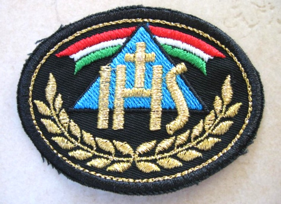 Az ovális fekete jelvény oválisan körbe arany szegéllyel rendelkezik. Középen kék háromszög a Szentháromság szimbólumaként. Előtte IHS felirat (Iesus Hominum Salvator – Jézus, az ember üdvözítője), úgy, hogy a H betűn apró latin kereszt található. Az IHS a kereszténységben Jézus nevének görög rövidítéséből származó monogramja. A korai kereszténységben Jézus nevét gyakran rövidítették a görög ΙΗ (Ἰησοῦς – Iészusz - Jézus) illetve ΧΡ (Χριστός – Khrisztosz - Krisztus) betűkkel. Szokásos volt még az utolsó betű hozzávétele a rövidítéshez, Σωτήρ (Szótér - Megváltó), ΙΗΣ illetve ΧΡΣ alakban. Az előbbi latinizálásából alakult ki és terjedt el az IHS forma a 6. századtól.