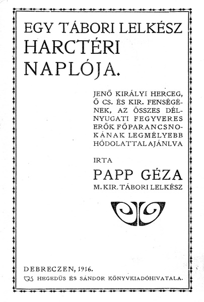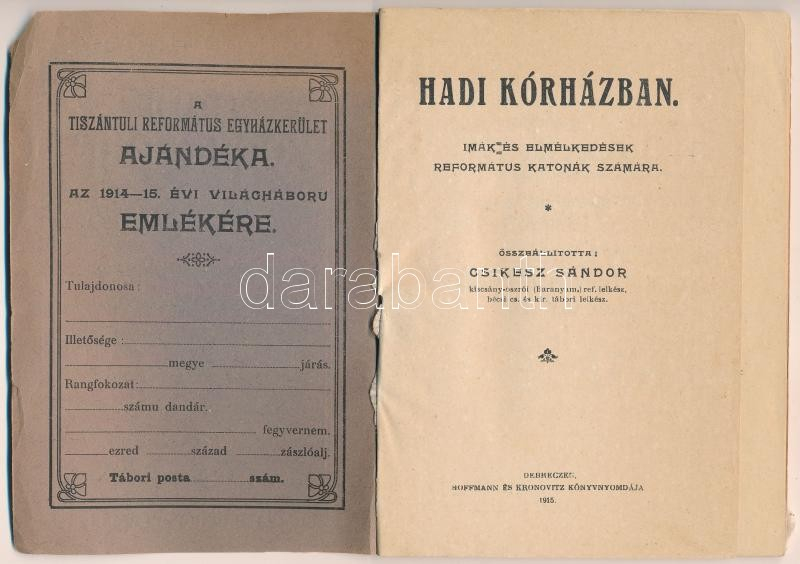 Csikesz Sándor: Hadi kórházban. Imák és elmélkedések református katonák számára, Hoffman és Kronovitz Könyvnyomdája, Debrecen, 1915.