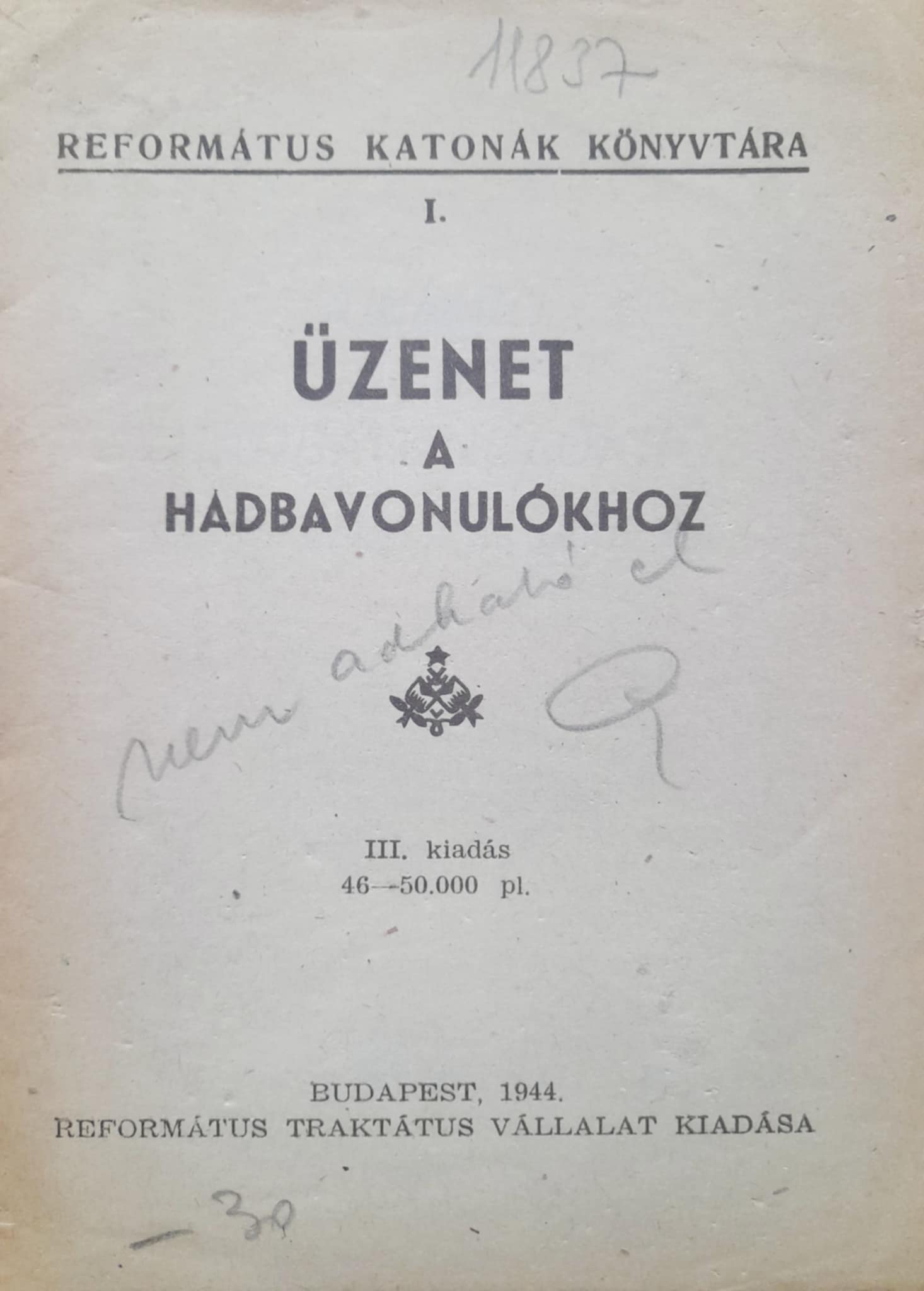 N.N.: Üzenet hadbavonultakhoz (Református Katonák Könyvtára I.), Református Traktátus Vállalt kiadása, Budapest, 1944.