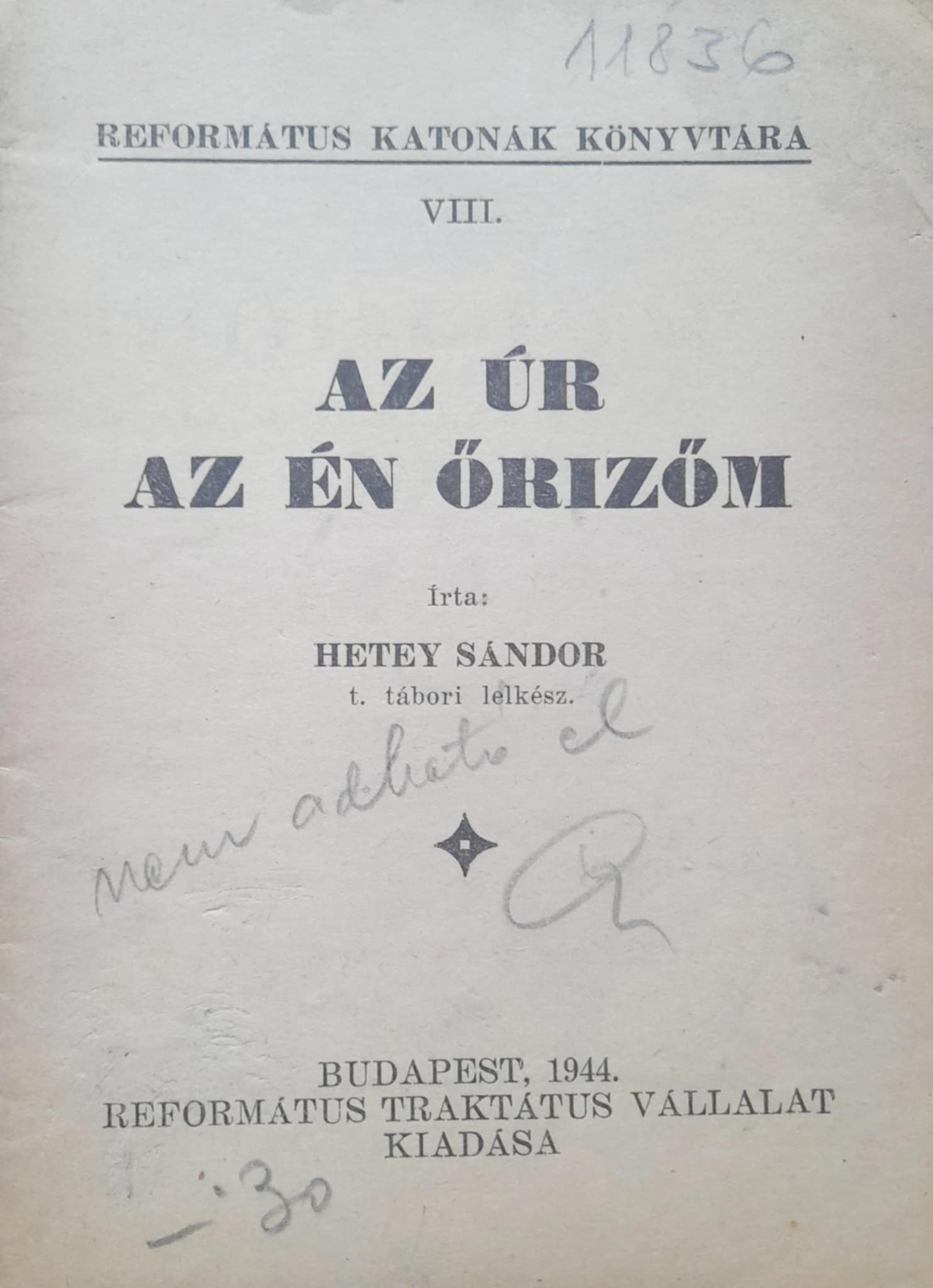 Hetey Sándor: Az Úr az én őrizőm (Református Katonák Könyvtára VIII.), Református Traktátus Vállalt kiadása, Budapest, 1944.