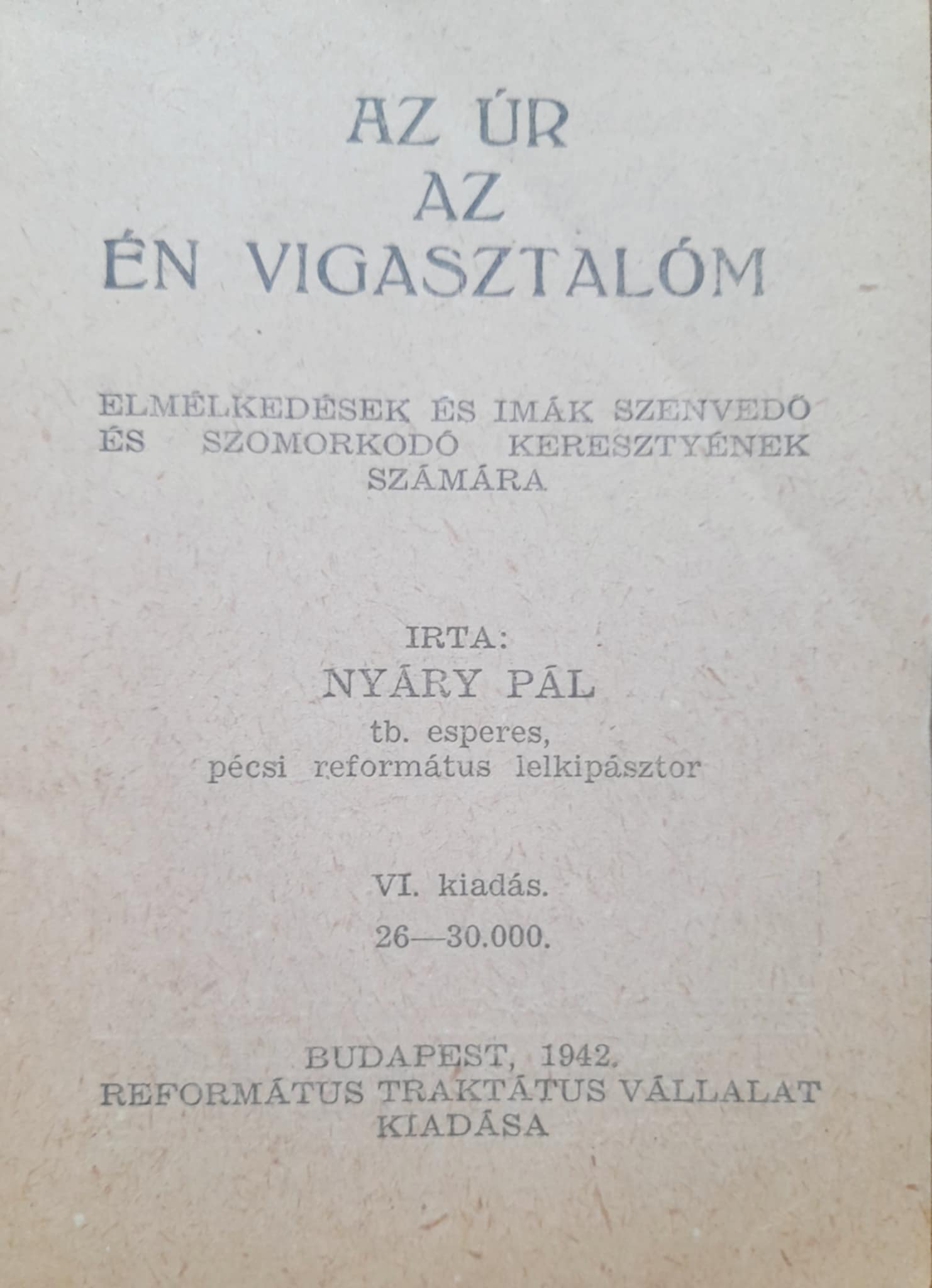 Nyáry Pál: Az Úr az én vígasztalóm. Elmélkedések és imák szenvedő és szomorkodó keresztyének számára, Budapest, Református Traktátus Vállalat, 1942.