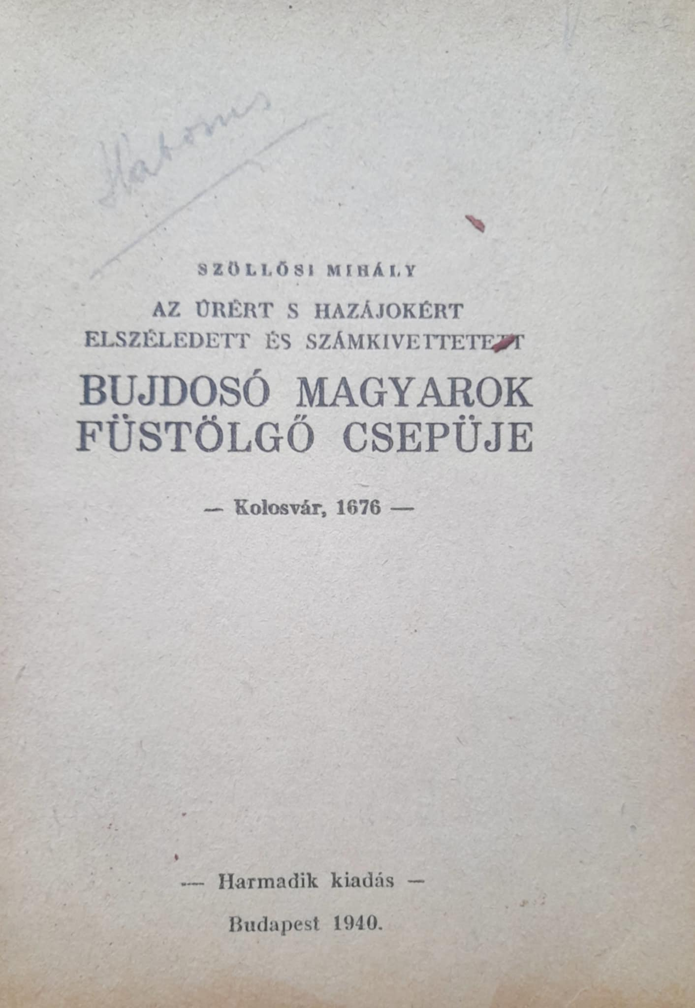 Szöllősi Mihály: Az Úrért s hazájokért elszéledett és számkivetett bujdosó magyarok füstölgő csepüje, Kolozsvár, 1676, Budapest, 1940.