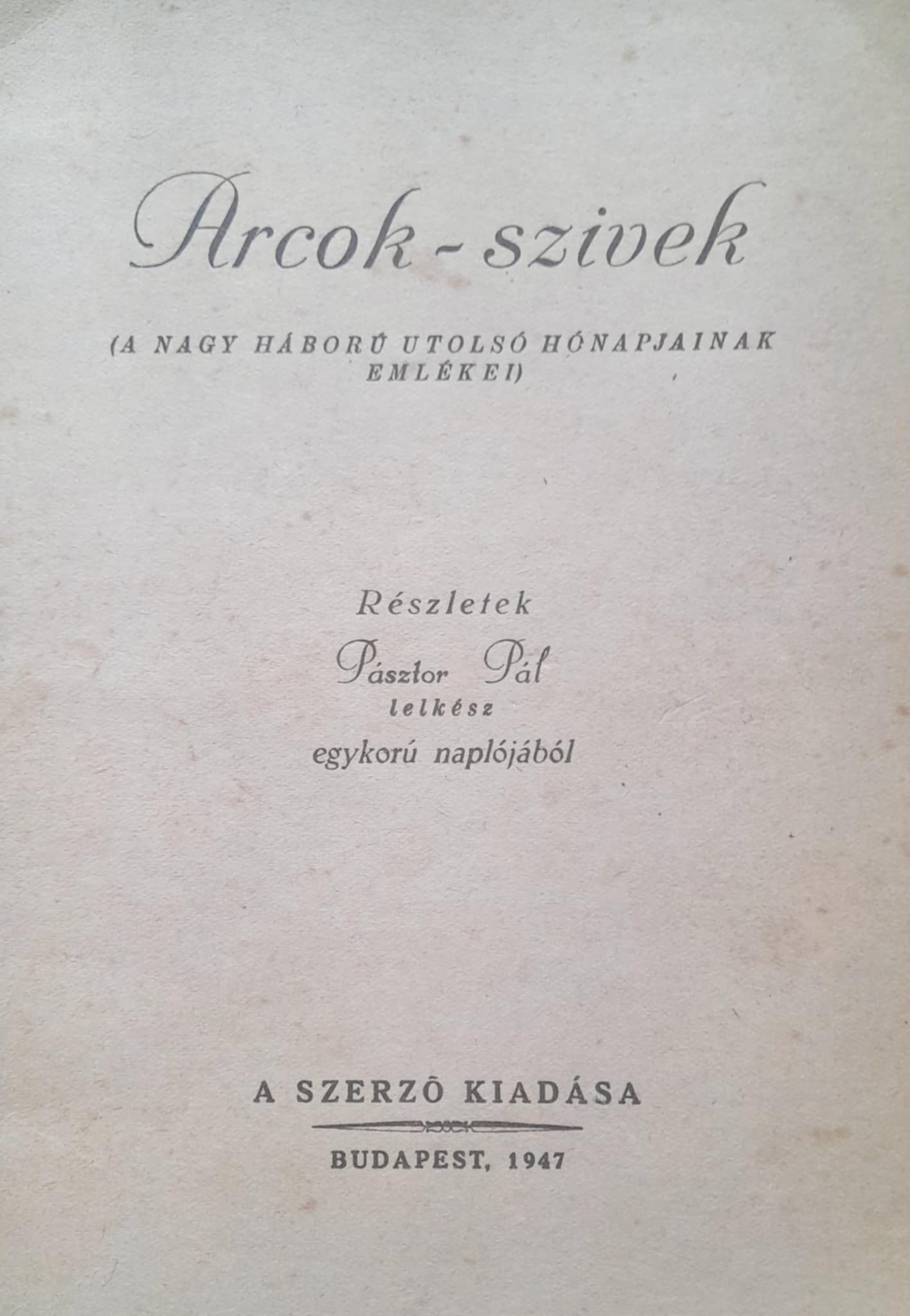 Pásztor Pál: Arcok-szívek. A nagy háború utolsó hónapjainak emlékei. Részletek Pásztor Pál lelkész egykorú naplójából, A szerző kiadása, Budapest, 1947.