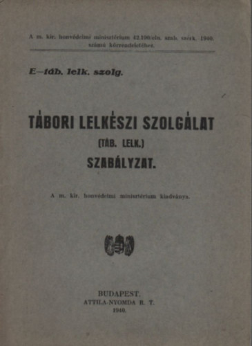 N.N.: Tábori Lelkészi Szolgálat szabályzat, A m.kir. honvédelmi minisztérium kiadványa, Attila Nyomda, Budapest, 1940.