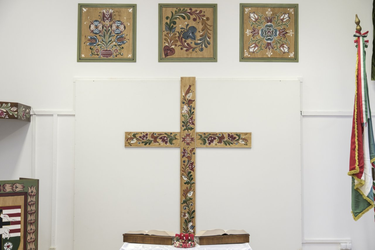 A terem református részében a falakon látható kazettás díszítés történelmi utalások sokaságát hordozza: teremtésmotívum, Krisztus születése, a tanítványok szétáradása a világ négy tája felé. – A katonáknak mindez nem idegen: nemcsak a tanítványok rajzottak ki a négy világégtáj irányába, hanem sok esetben az itt szolgáló katonák is – fejti ki a tábori lelkész.